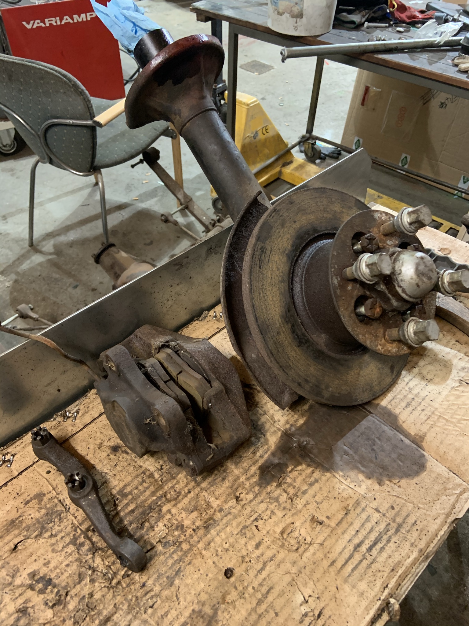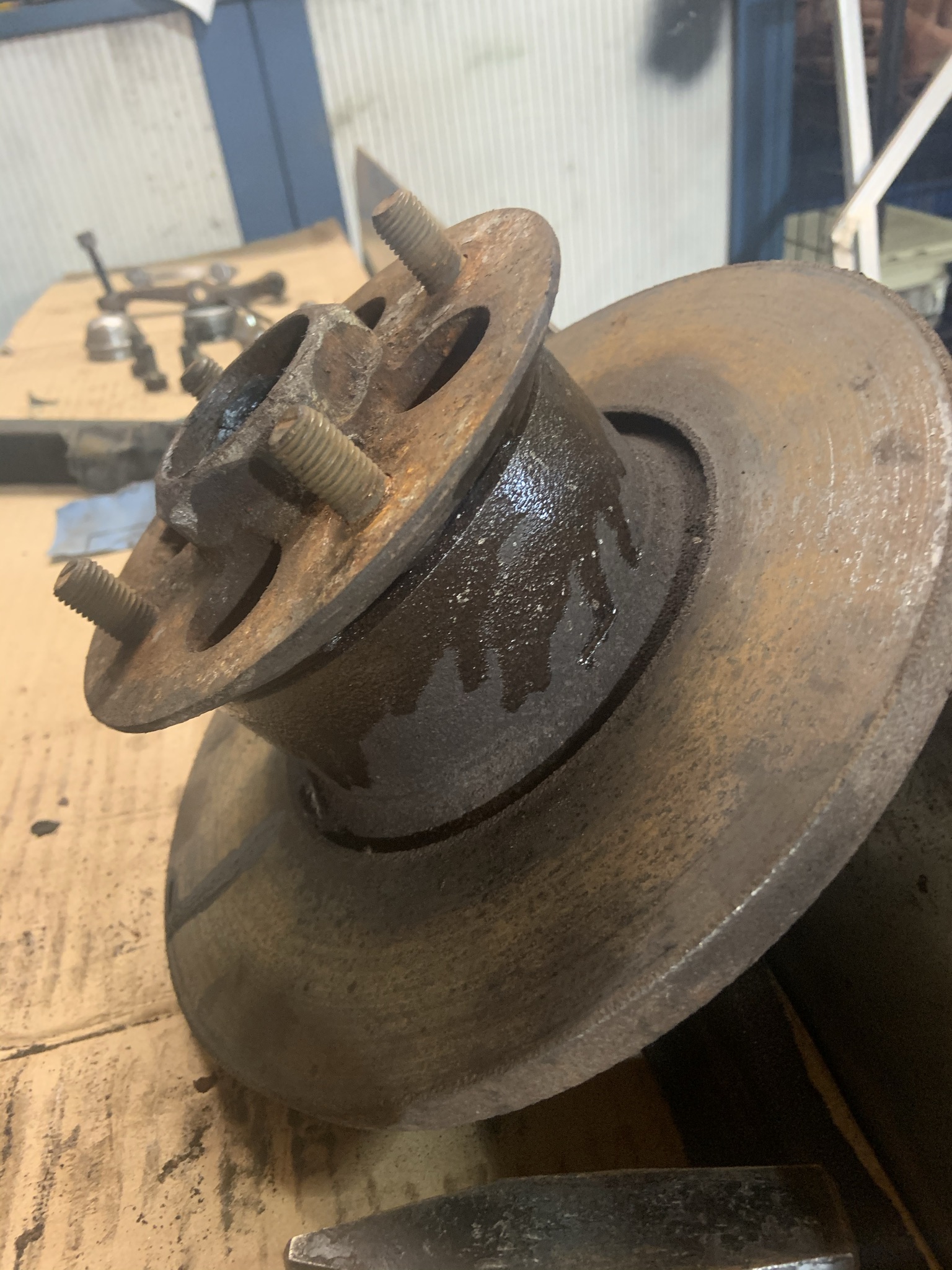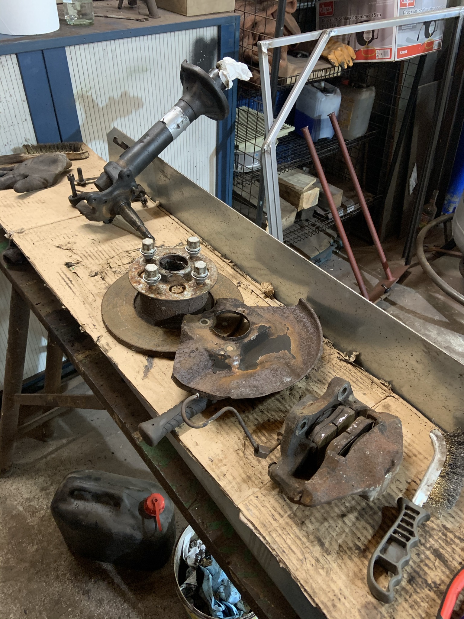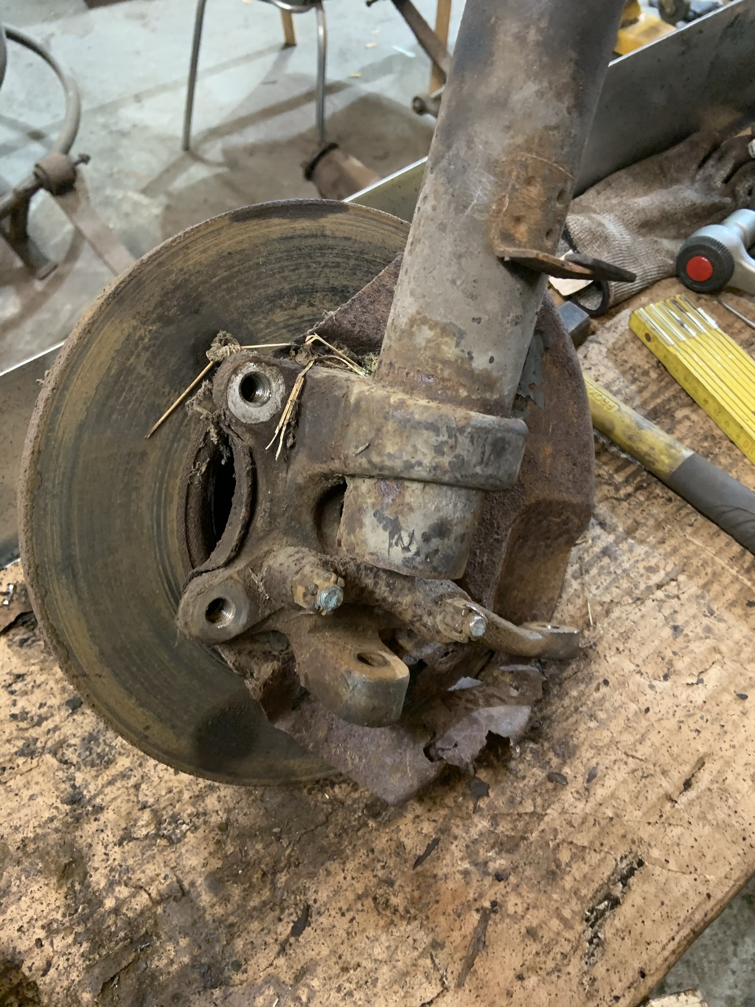 Radnarbendeckel ab, Splint raus, Sicherungsdings auch ab, Schraube lösen und schon geht die Bremsscheibe incl. “Radaufnahme” ab. Dann noch etwas WD40, Geduld und Hammerschläge. Dann trennt sich auch was eigentlich zusammen bleiben wollte 😉