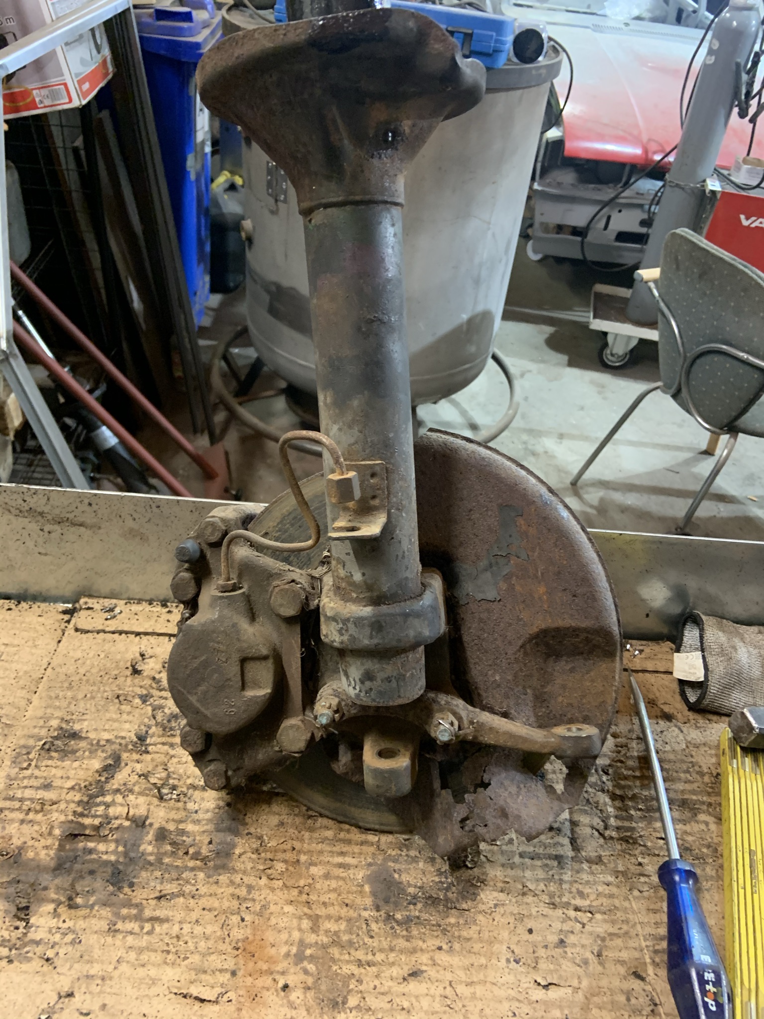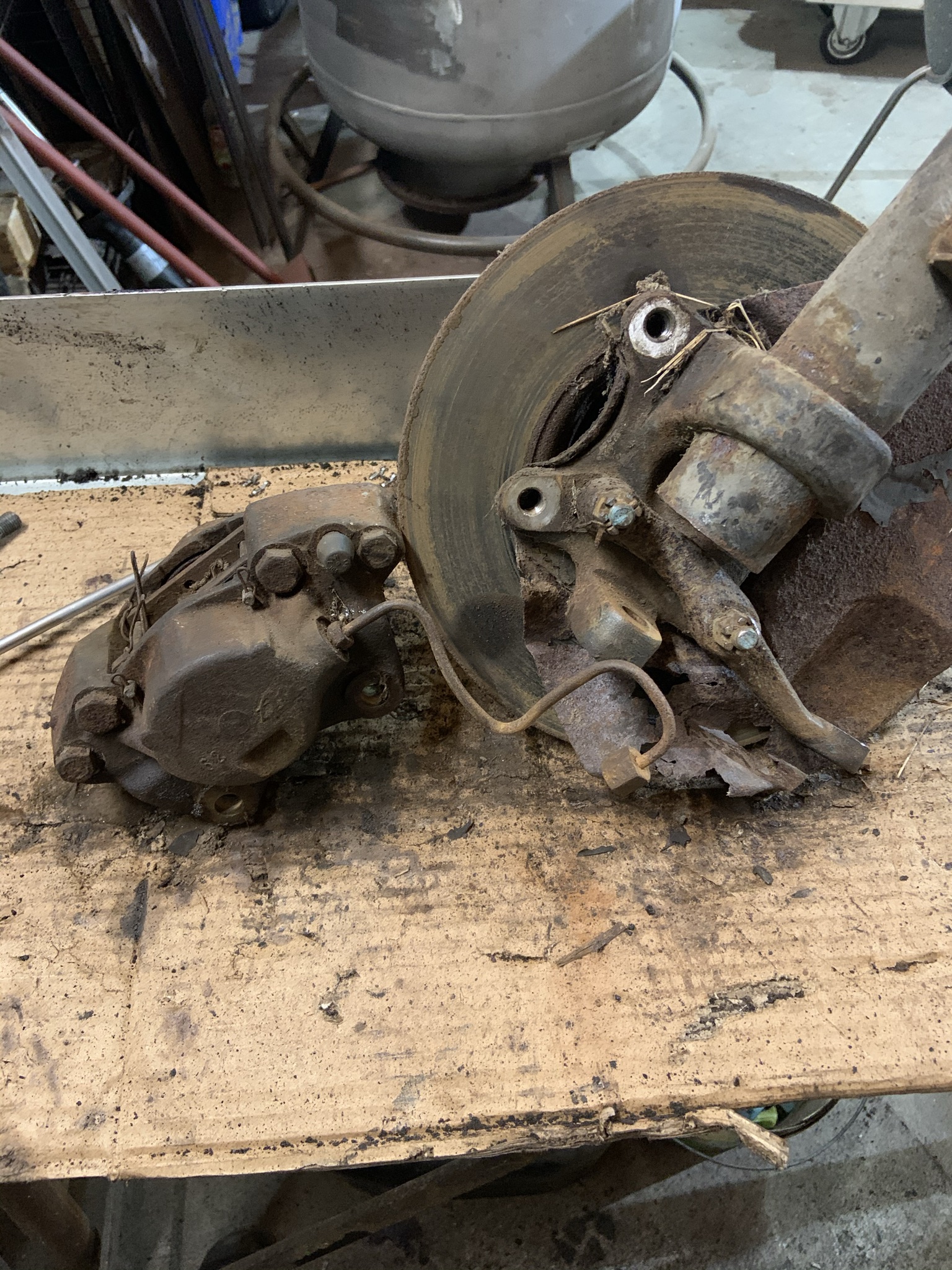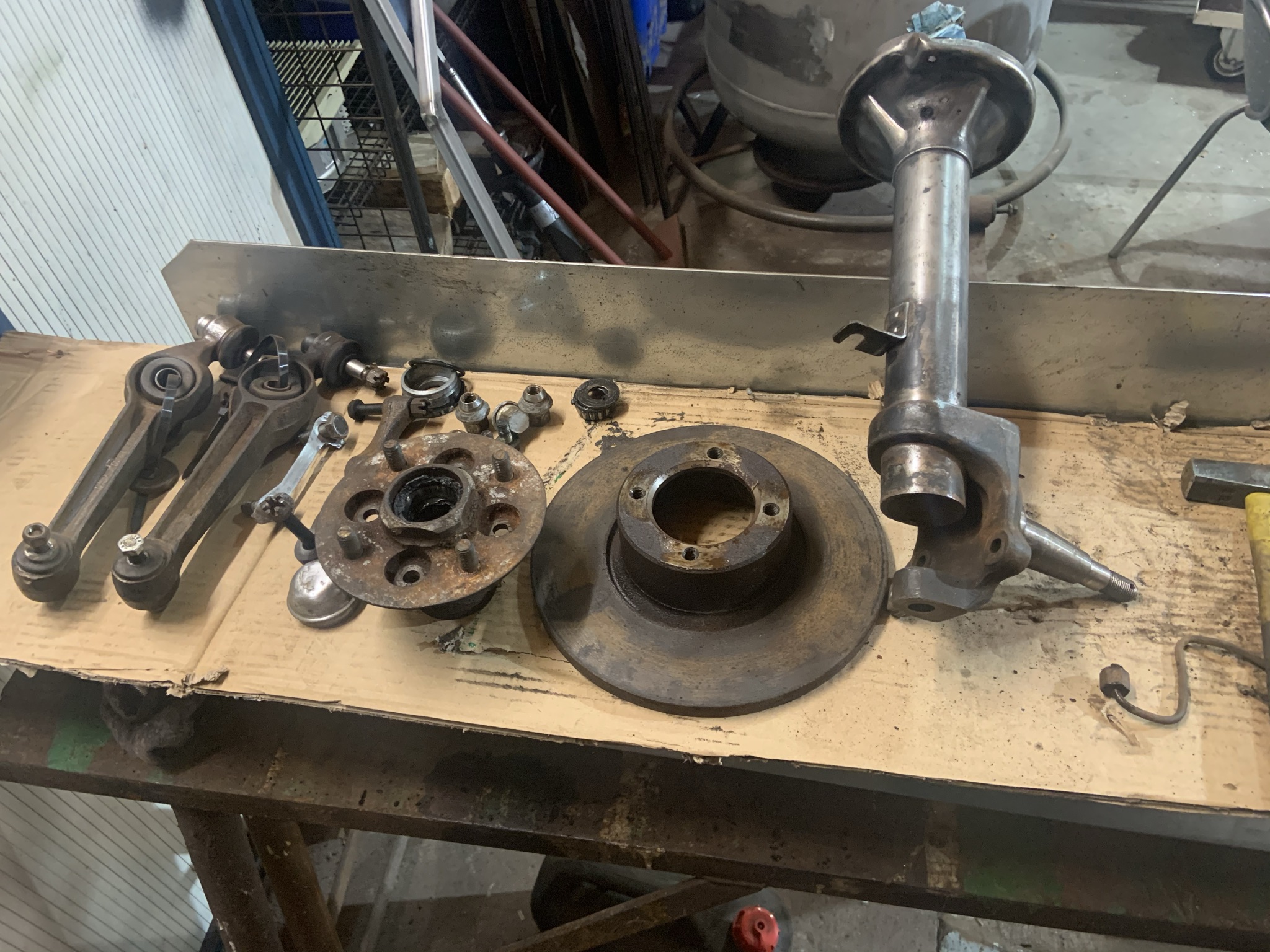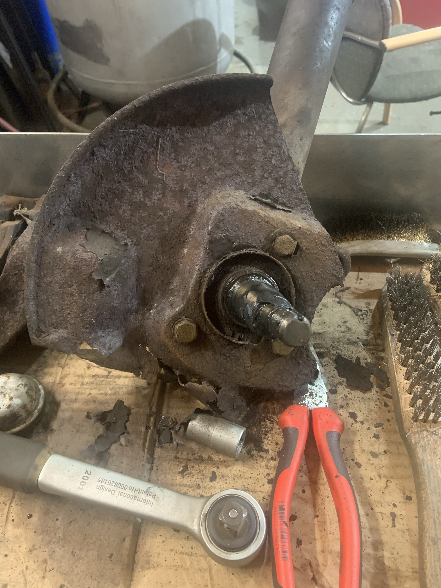 Radnarbendeckel ab, Splint raus, Sicherungsdings auch ab, Schraube lösen und schon geht die Bremsscheibe incl. “Radaufnahme” ab. Dann noch etwas WD40, Geduld und Hammerschläge. Dann trennt sich auch was eigentlich zusammen bleiben wollte 😉